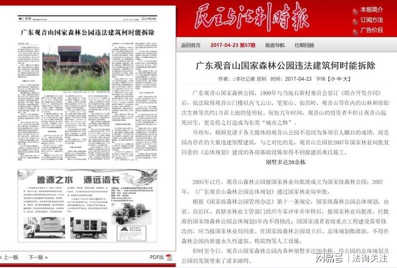 “观音山大规模毁林事件”之一: 《民主与法制时报》报道的《广东观音山国家森林公园违法建筑何时能拆除》